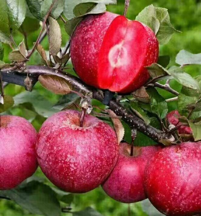 🍎Red-fleshed apples are sweet and juicy, rosy red from peel to core, with a faint white edge around the core, resembling a heart shape when the apple is cut into quarters.🍎