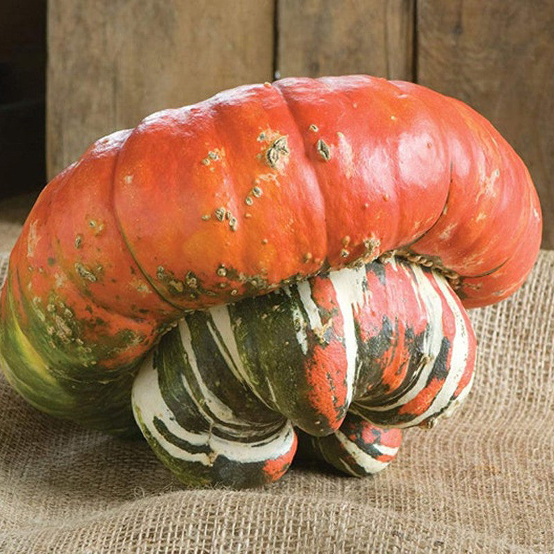 Turk's Turban Squash is a distinguished winter squash with a smooth colorful hat-like structure wrapped above a striped curved fruit. Like a colorful Middle-Eastern Turban, Turk's Turban has a deep orange base color with a mottling of yellow, white, and dark green splotches and striations. A beautiful display of Fall colors in the most unique pumpkin shape. The flesh inside is pale yellow and the flavor of turban squash is mild and slightly nutty, with a soft, floury texture.